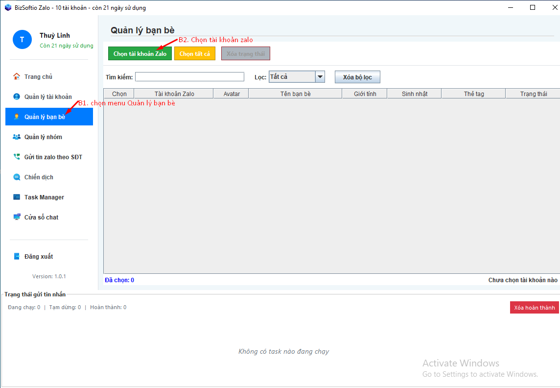 Bước 1: Mở phần mềm, tại Menu chọn Quản lý lý bạn bè. Sau đó nhấn nút Chọn tài khoản Zalo:
