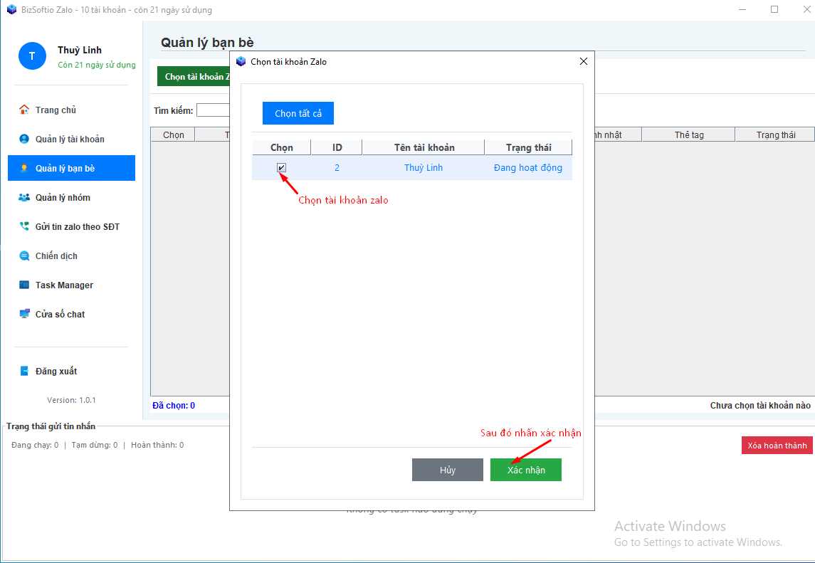 Bước 2: Sau khi đã chọn tài khoản Zalo và nhấn Xác nhận, lúc này chúng ta đã load được danh sách bạn bè như sau: