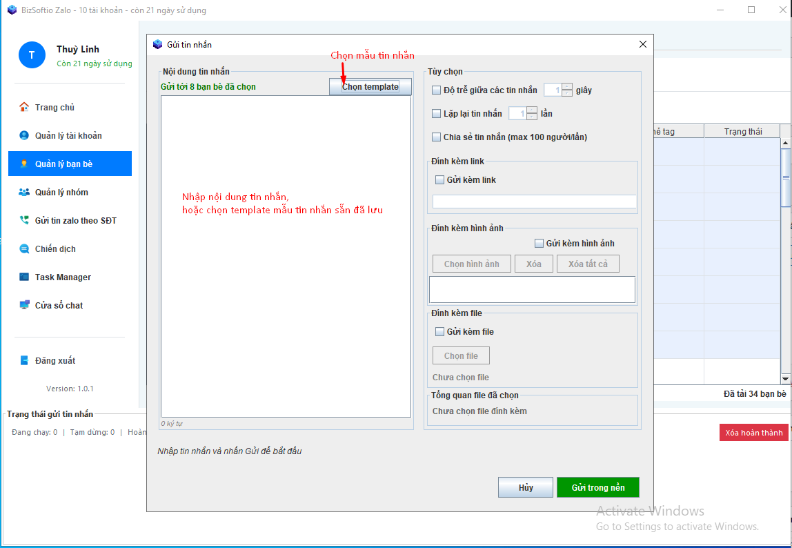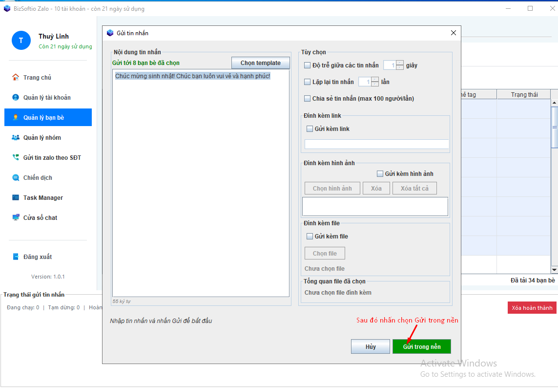 Sau khi thiết lập tin nhắn và cài đặt cấu hình xong bạn nhấn chọn Gửi trong nền để bắt đầu gửi tin nhắn:
