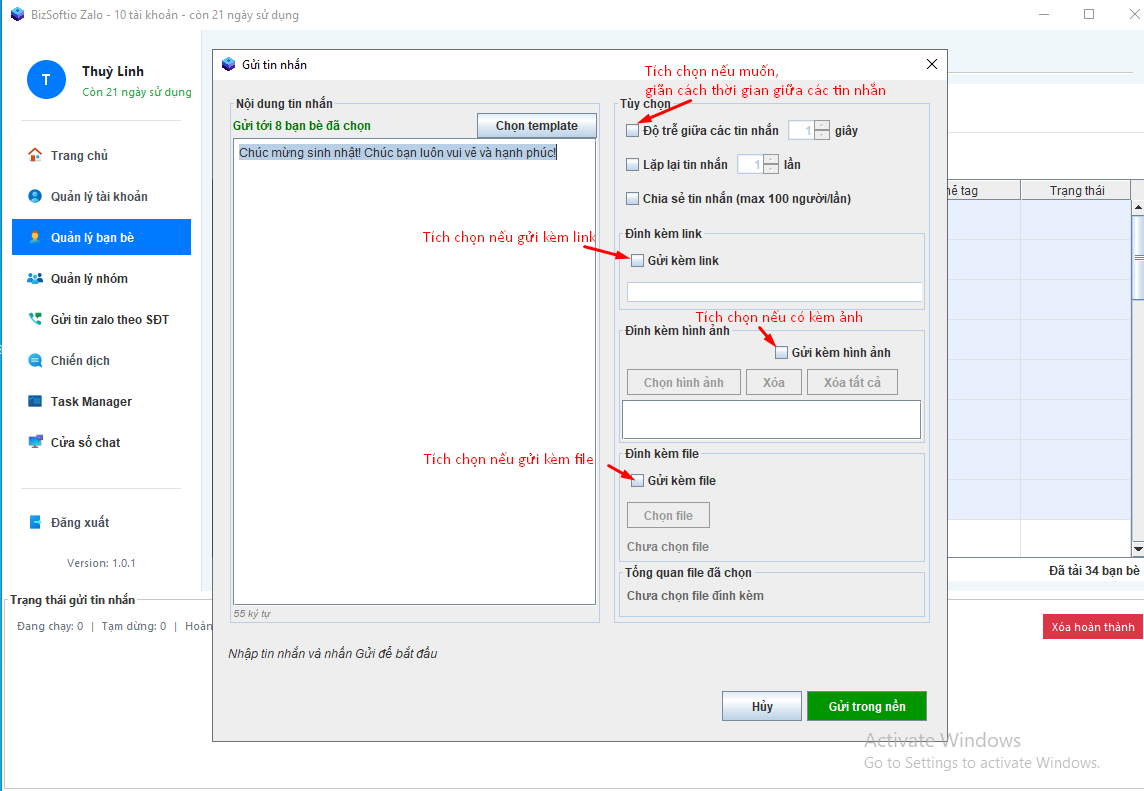 Có thể tùy chọn gửi kèm ảnh, kèm link, kèm file và cài đặt thời gian delay giãn cách gửi tin giữa các bạn bè nếu muốn: