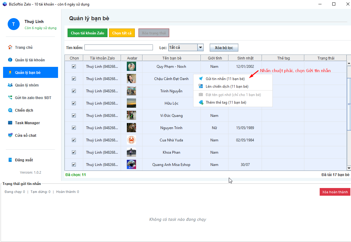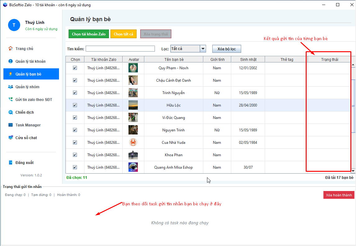 Tiếp đó bạn theo dõi kết quả Task gửi tin nhắn vừa thiết lập xong ở dưới và cột trạng thái ở bảng danh sách bạn bè: