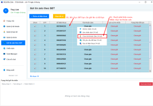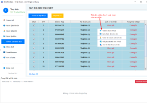 - Bước 5: Sau khi gán xong tài khoản zalo cho danh sách SĐT. Bạn nhấn chuột phải hiện thị menu chọn Gửi tin nhắn hoặc gửi lời mời kết bạn: